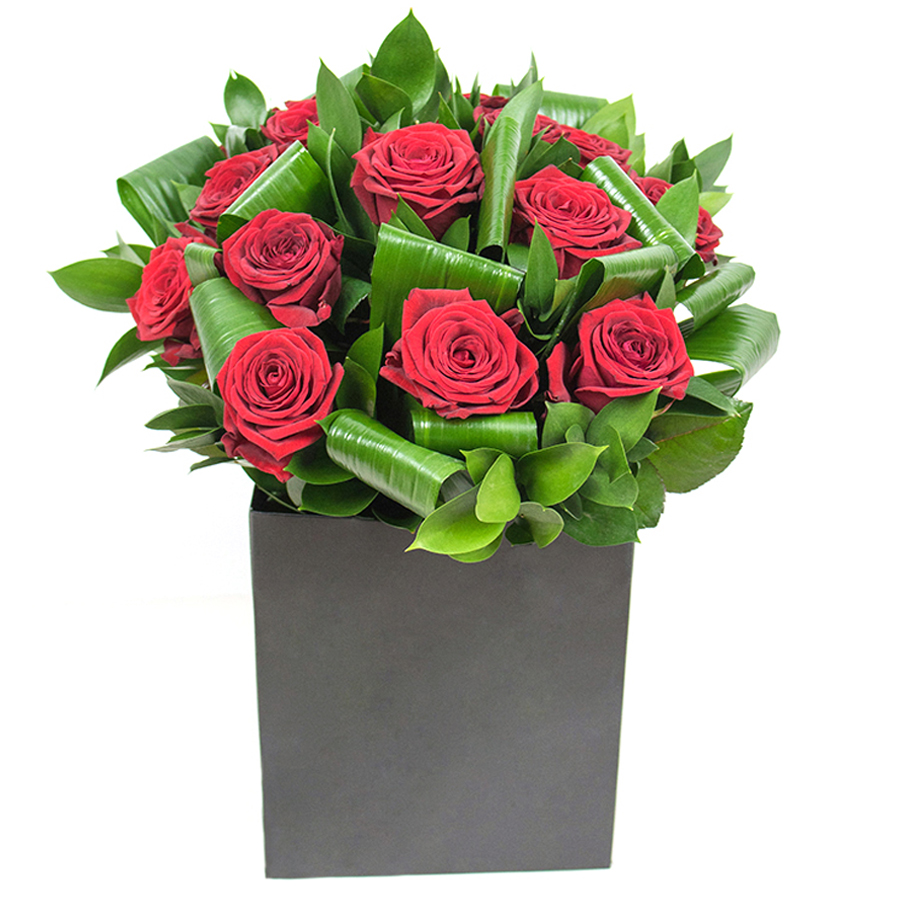 Celebrate love and life with our radiant red roses surrounded by elegant aspidistra leaves and ruscus. Every flower is meticulously selected to guarantee ultimate freshness and quality. This stunning bouquet exudes passion and style, offering a perfect blend of classic beauty and modern flair.